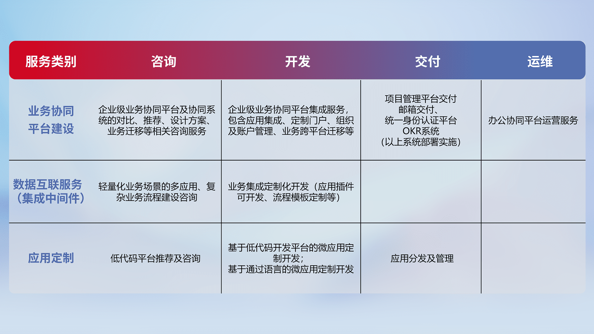 针对钉钉、、企微、、IDaas等平台级产品提供产品的规划、、、、方案、、交付、、、定制化开发等服务,,实现如统一协同办公、、、智能客户服务、、混合会议管理、、、、智能数据查询、、、等业务场景,,,实现数字化转型。。。。